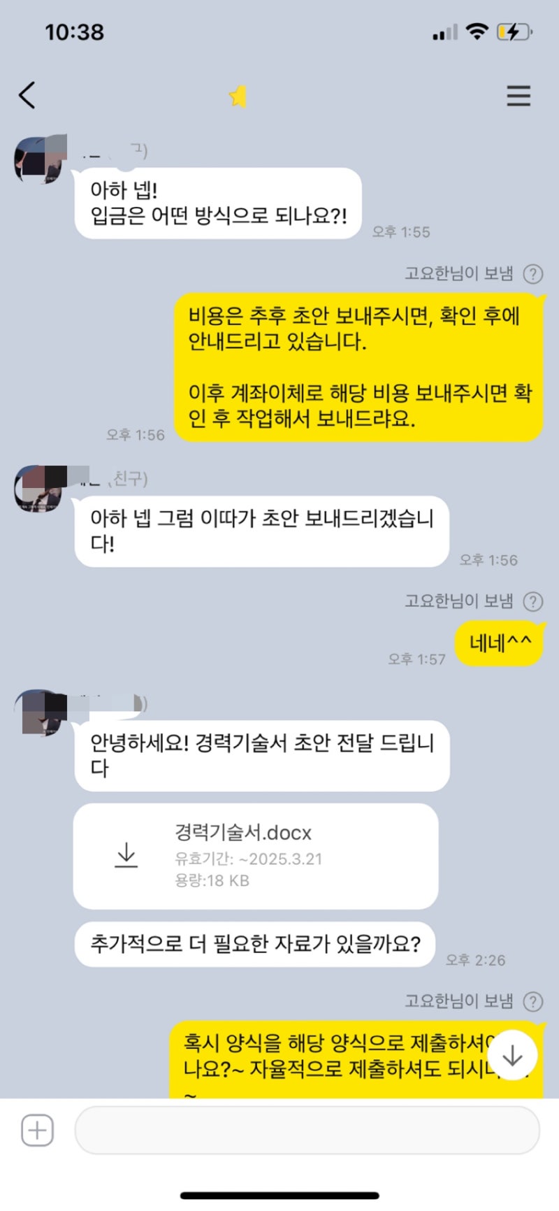 진짜 이건 거의 대필 수준으로 갈아엎었어요! 고객님이 전에 쓰셨던 자소서를 들고 오셨는데, 글자 수도 안 맞고 문장도 엉망이어서 첨삭하면서 거의 다시 짰다고 봐야 해요 제발 다음엔 하루 전에는 와주셔요..! 진짜 그래야 저도 여유 있게 도와드릴 수 있거든요