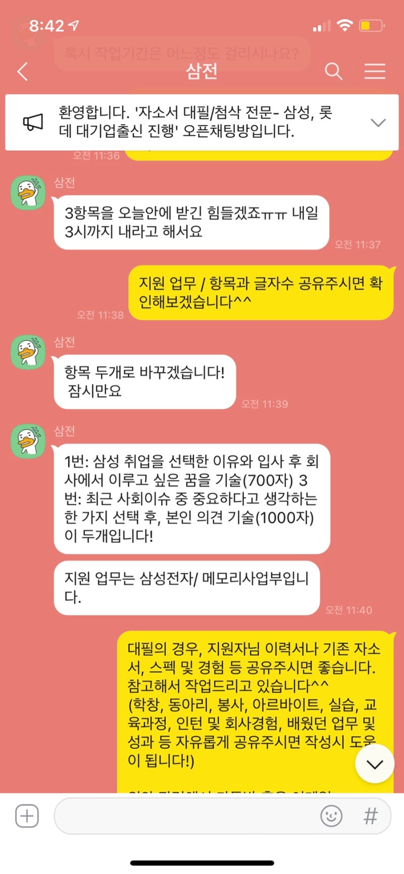 1차적으로 자기소개서의 전반적인 구조와 논리 흐름을 개선하고, 각 문항별로 요구하는 핵심 역량을 명확하게 제시하는 데 집중했습니다. 또한, 김OO 님의 개성과 스토리를 살려 진솔하고 설득력 있는 자기소개서를 완성하는 데 주력했습니다. 진짜 이건 거의 대필 수준으로 갈아엎었어요! 김OO 님이 전에 쓰셨던 자소서를 들고 오셨는데, 글자 수도 안 맞고 문장도 그대로 첨삭하면서 거의 다시 짰다고 봐야 해요 제발 다음엔 하루 전에는 와주셔요..! 진짜 그래야 저도 여유 있게 도와드릴 수 있거든요