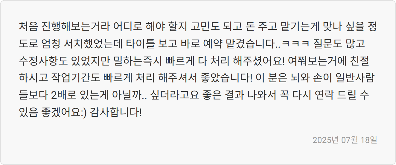 첫째, 객관적인 시선으로 글의 논리적 흐름과 문장 표현을 다듬을 수 있습니다. 본인이 작성한 글은 익숙해서 놓치기 쉬운 오타, 반복 표현, 모호한 문장 등을 전문가가 잡아줍니다.
