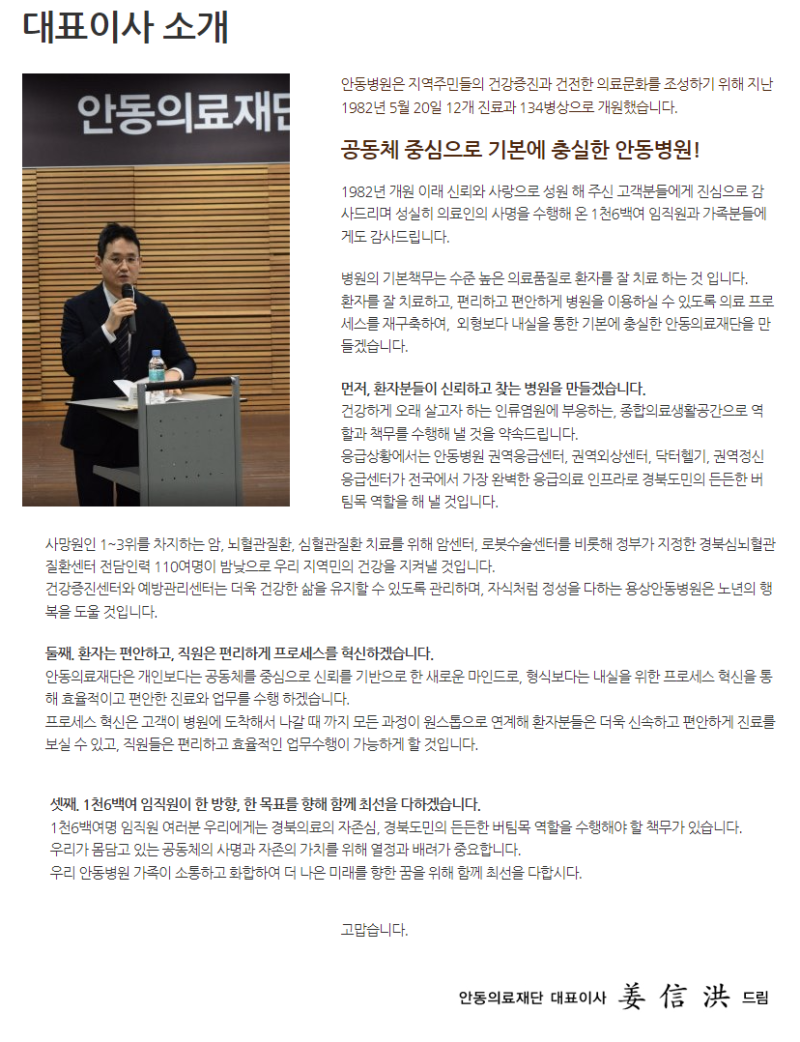 안동병원은 단순한 치료를 넘어, 환자의 삶의 질 향상과 지역 사회 건강 증진에 기여하는 것을 목표로 합니다.