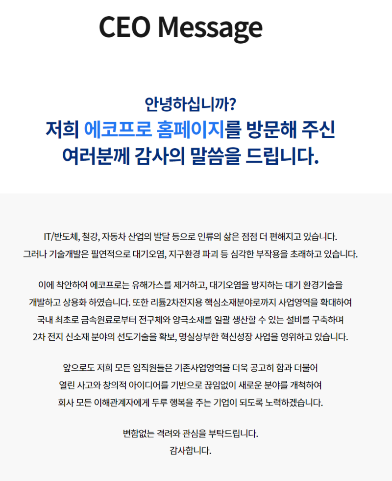 환경 사업: 대기오염 방지 및 온실가스 저감 기술을 개발하고, 관련 설비를 생산합니다. 친환경 기술을 통해 지속 가능한 환경을 만드는 데 기여합니다.