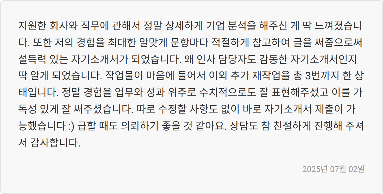• ✍️ 강점 부각: 지원자의 핵심 역량과 경험이 명확히 드러나도록 문장을 재구성합니다.