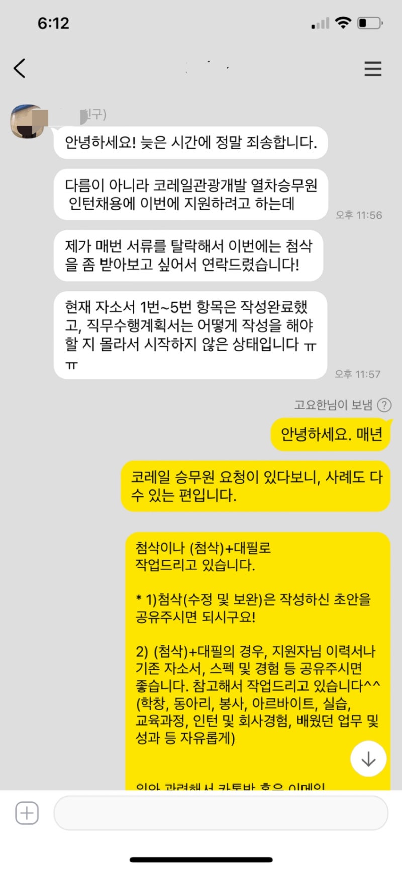 공유해주신 이력서와 자기소개서를 토대로, 지원자분의 강점과 약점을 꼼꼼하게 분석합니다. 단순히 문장 표현을 다듬는 것이 아니라, 코레일의 인재상과 직무 특성에 맞춰 스토리를 재구성하는 데 집중합니다.