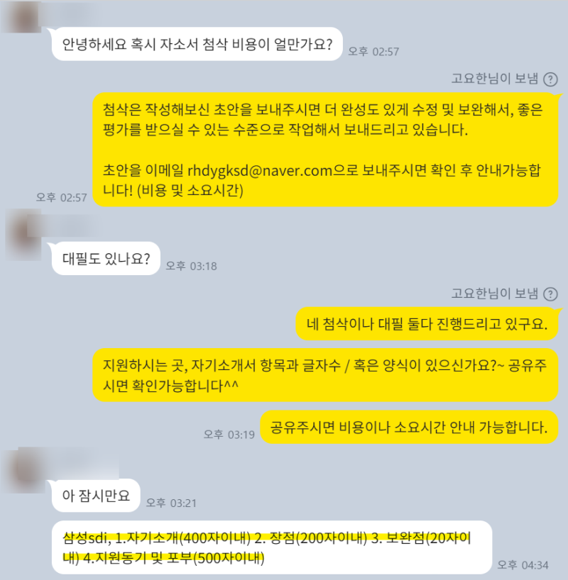 - >> 4단계: 결제 확인 후, 본격적인 1:1 자소서 작성/첨삭 작업 시작!