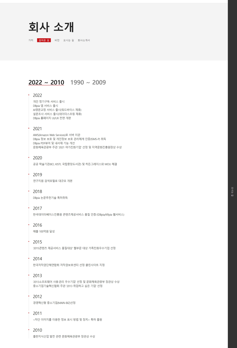 - ▲ 주요 사업: 학술 데이터베이스(DB) 구축 및 서비스(‘DBpia’ 등), 전자책 솔루션, 온라인 교육 콘텐츠 개발, 연구 관리 시스템 등 다양한 지식 정보 플랫폼을 운영하고 있습니다.